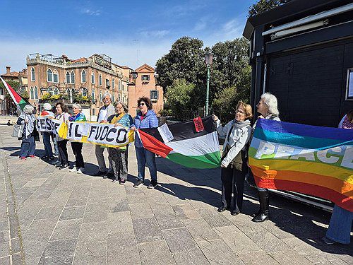 (베네치아=연합뉴스) 황희경 기자 = 17일(현지시간) 베네치아 비엔날레 현장에서 시위대가 팔레스타인 국기를 들고 평화를 촉구하는 모습. 2024.4.17.
