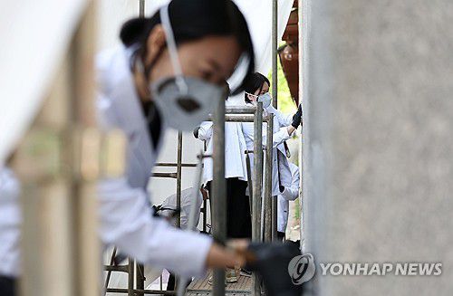 18일 오전 9시께 서울 경복궁 영추문 앞. 흰색 가운을 입고 마스크를 쓴 '작업자' 9명이 가림막 안으로 조심스레 들어갔다.