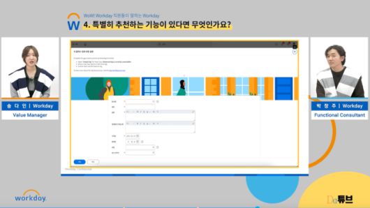 18일 워크데이는 <디지털데일리> 웨비나 플랫폼 DD튜브에서 ‘WOW! 워크데이(Workday) 직원들이 말하는 Workday’ 주제로 워크데이 솔루션 장점과 특징들을 소개했다. 워크데이에서도 HR솔루션 워크데이를 도입해 사용 중이다. 웨비나에선 실제 직원들이 참가해 이용자 관점에서 워크데이 사용 후기와 의견들을 나눴다.