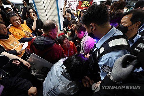 (서울=연합뉴스) 윤동진 기자 = 장애인의 날인 20일 오전 서울 한성대입구역에서 전국장애인차별철폐연대(전장연)를 비롯한 참가자들이 다이 인 퍼포먼스를 진행하려하자 교통공사 관계자들이 저지하고 있다. 2024.4.20