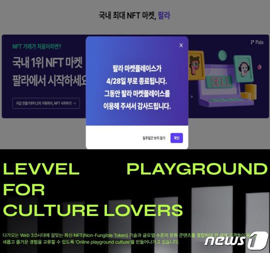 (위쪽부터) 영업 종료를 선언한 팔라와 두나무 NFT 계열사 레벨스. (공식 홈페이지 갈무리) |