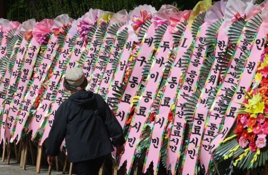 지난 17일 오전 국회 헌정회관 앞에 한동훈 전 국민의힘 비상대책위원장을 응원하는 화환이 놓여있다. 연합뉴스 |