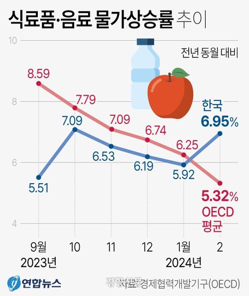2월 기준 우리나라의 식료품·비주류음료 물가 상승률은 통계가 집계된 35개 회원국 중 튀르키예(71.12%), 아이슬란드(7.52%)에 이어 세 번째로 높았다.