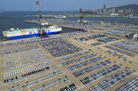 전기차 수요 둔화와 물류 병목 현상이 겹치며 유럽의 주요 항구가 주차장으로 변하고 있다. 사진은 지난해 7월 중국 동부 산둥성 옌타이의 한 조선소에 수출용 신형 차량이 쌓여 있는 모습. AP뉴시스 |