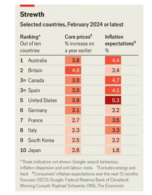 이번 조사에서 대체로 영어권 국가가 부진한 모습이었다. 호주가 1위(근원 3.8%, 기대 4.4%), 영국이 2위(근원 4.8%, 기대 2.4%)였다. 미국은 5위(근원 3.9%, 기대 5.3%)였다.