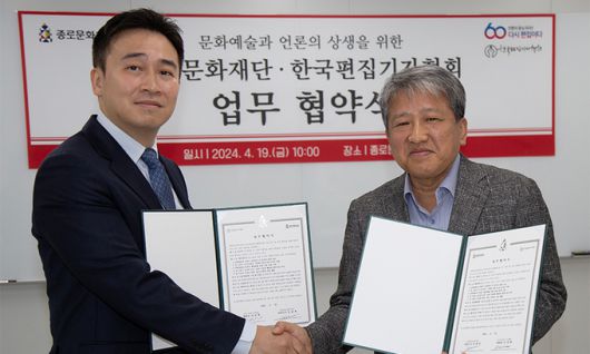 김창환 한국편집기자협회장(왼쪽)과 유광종 종로문화재단 대표이사가 지난 19일 종로문화재단에서 문화예술과 언론의 상생을 위한 업무협약(MOU)을 체결한 뒤 기념촬영을 하고 있다. 두 기관은 7월 종로에서 협회 창립 60주년을 기념한 전시를 시작으로 문화예술과 언론의 상호 발전을 위해 긴밀하게 소통할 예정이다. 한국편집기자협회 제공 ⓒ 세상을 보는 눈, 세계일보