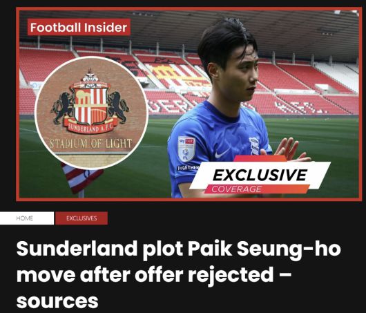 이어 "블랙 캣츠(선덜랜드 별칭)는 지난겨울 백승호와 계약을 놓고 잠재적인 대화를 나눈 것으로 여겨지고 있으나 백승호는 버밍엄 시티 이적을 선택했다. 유력한 소식통들은 선덜랜드가 여전히 백승호와 계약하기를 열망하고 있고 새로운 추격을 준비 중이라고 말했다"고 했다.