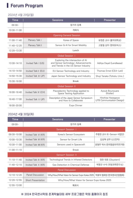 ‘2024 국제첨단센서 산업포럼’ 사전등록 방법 및 세션별 자세한 내용은 한국센서학회 홈페이지(https://sensors.or.kr/conference/sensor24s/static/30)에서 확인할 수 있다.