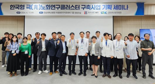 GIST 고령친화산업지원센터가 한국형 극(克)노화연구클러스터 구축사업 기획 세미나를 개최하고 참석자들이 기념사진 촬영을 하고 있다.[GIST 제공] |