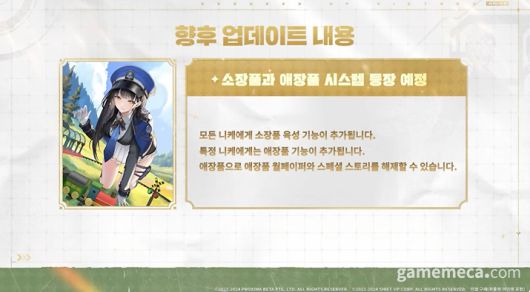 향후 업데이트로는 지난 1주년 때 선보였던 미니게임 MOG를 2.0 버전으로 출시해 상시 콘텐츠로 선보인다. 이어서 모든 니케에 소장품 육성 기능이 추가되며, 특정 니케에는 애장품이 추가된다. 애장품을 통해 스킬 특성을 강화할 수 있고, 월페이퍼와 스페셜 스토리를 해제할 수 있다.