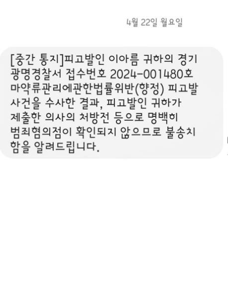이와 함께 아름은 경찰로부터 받았다는 문자 메시지를 공개했다. 문자에 따르면 경기 광명경찰서는 '마약류관리에관한법률위반(향정) 피고발 사건을 수사한 결과; 피고발인 귀하가 제출한 의사의 처방전 등으로 명백히 범죄혐의점이 확인되지 않으므로 불송치함을 알려드린다'고 전했다.