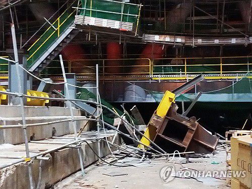 구조물 일부가 내려앉은 HD현대중공업 사고 현장 |