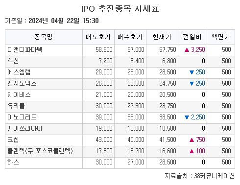 바이오 전문 신약 개발기업 디앤디파마텍은 이날부터 이틀간 공모주 청약을 진행한다. 디앤디파마텍은 이날 5.96% 오른 5만7750원이었다.