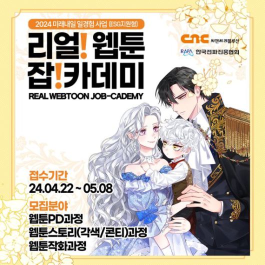 프로그램 관련 상세 안내사항과 모집요강은 씨엔씨레볼루션(주), 한국전파진흥협회 홈페이지의 공지사항 ‘2024 리얼 웹툰 잡카데미 교육생 모집’에서 확인가능하며, 서류 제출 마감일은 5월 8일이다. 참가자는 서류 심사와 면접심사를 거쳐 최종 선발된다.