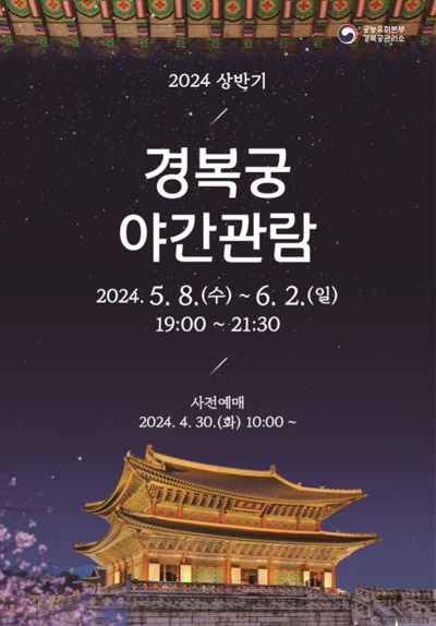 관람 시간은 오후 7시부터 9시30분까지다. 입장은 오후 8시30분에 마감한다. 매주 월·화요일과 5월 17∼19일에는 야간 관람이 열리지 않는다. 1일당 관람권 판매 수량은 3000매로, 이달 30일 오전 10시부터 온라인으로 예매 가능하다. 외국인은 당일 광화문 매표소에서 현장 발권할 수 있다.