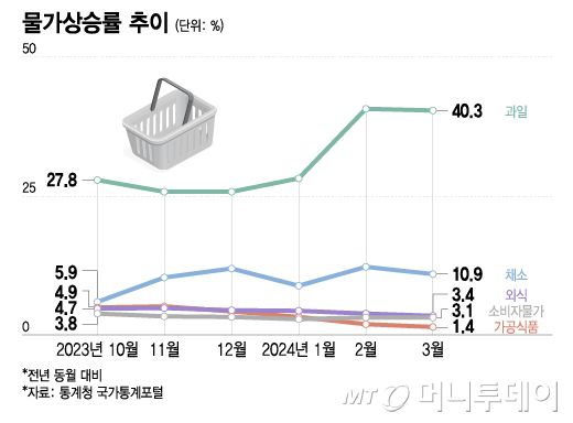 한국은 채소, 과일 등 신선식품·농산물과 외식 물가가 식품 물가를 전반적으로 끌어올린 것으로 분석됐다. 통계청 국가통계포털에 따르면 지난달 기준 품목별 물가 상승률은 외식 3.4%, 채소 10.9%, 과일 40.3%로 모두 소비자물가 상승률(3.1%)을 웃돈다.