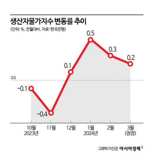 생산자물가지수는 전월 대비 작년 10월(-0.1%), 11월(-0.4%) 감소하다 12월(0.1%), 올해 1월(0.5%), 2월(0.3%), 3월(0.2%) 상승하며 4개월째 오름세다.