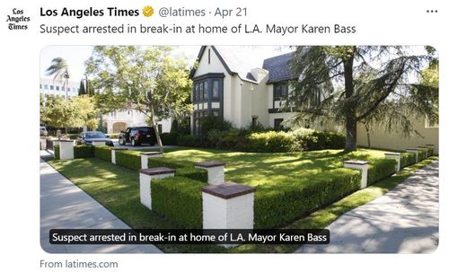 LA 시장 공관에 괴한이 침입했다는 소식 전하는 LA타임스 엑스 게시물 |