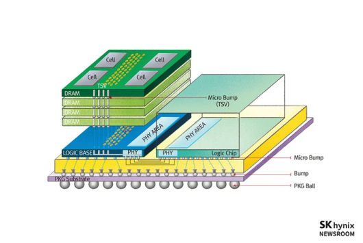 2.5D 패키지. HBM은 그래픽처리장치(GPU)와 빠른 신호 전달을 위해 같은 인터포저 위에 패키징된다. HBM 제일 하단에는 GPU와 통신을 위한 로직 베이스 다이가 자리한다. |