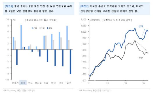 민 연구원은 “전세계 지수가 4월에만 5.1% 하락했음을 고려하면 수익률의 정체도 충분히 좋은 성과였으며 중국 증시의 낮은 변동성은 유가와 금리 상승 영향에서 자유롭기 때문”이라고 분석했다.