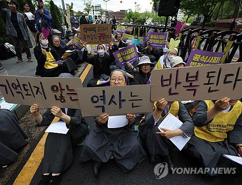 (서울=연합뉴스) 이지은 기자 = 24일 서울 종로구 주한일본대사관 인근에서 열린 1645차 일본군성노예제 문제해결을 위한 정기 수요시위에서 참가자들이 손팻말을 들고 있다. 2024.4.24