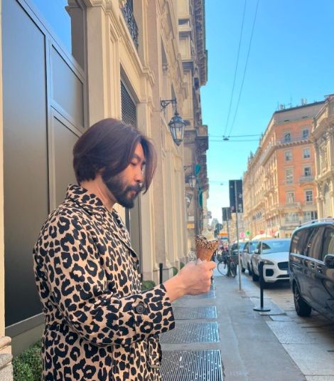 사진 속 노홍철은 호피 무늬 롱코트를 입은 채 밀라노 거리를 걷고 있다.