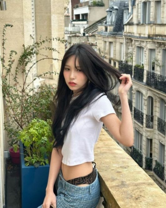 공개된 사진에는 테라스에서 포즈를 취하고 있는 미나의 모습이 담겼다. 로우라이즈 데님에 속옷을 노출한 과감한 룩을 선보이고 있다.