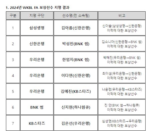 23일까지 FA 영입 구단이 보호 선수 명단을 제출했고, 이후 24일까지 원소속 구단이 보상 선수와 보상금 중 하나를 택한 가운데 WKBL은 24일 2024년 FA 보상 선수 지명 결과를 발표했다.