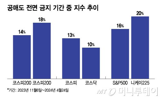25일 한국거래소에 따르면 당국이 공매도를 전면 금지한 지난해 11월6일부터 전날까지 코스피200과 코스닥150은 각각 14%, 18% 올랐다.