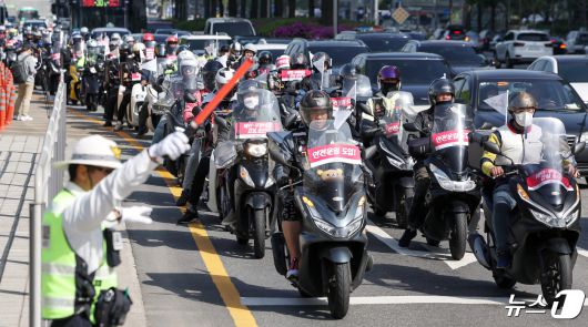 (서울=뉴스1) 민경석 기자 = 공공운수노조 라이더유니온지부 조합원들이 25일 오후 서울 송파구 올림픽공원 앞위례성대로에서 배달 업계에 안전운임제도 도입과 기본 배달료 인상을 촉구하며 '제7회 라이더 대행진'을 하고 있다. 2024.4.25/뉴스1newsmaker82@news1.krCopyright ⓒ 뉴스1. All rights reserved. 무단 전재 및 재배포, AI학습 이용 금지.