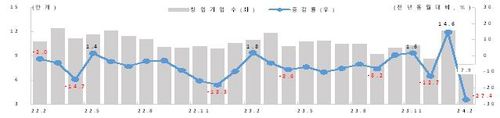 지난 2월 창업기업은 7만9천개로 고금리와 고물가 등의 영향으로 지난해 동월보다 27.4% 줄었다. 제조업(-31.6%), 건설업(-29.3%), 서비스업(-27.0%) 등 주요 업종에서 크게 줄었다.