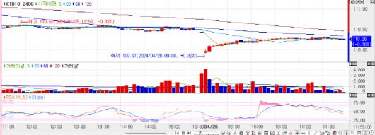수급별로 보면 3년 국채선물은 외국인 736계약, 개인 403계약, 은행 969계약 등 순매수를, 투신 1379계약, 금융투자 583계약, 연기금 155계약 등 순매도를 보인다. 10년 국채선물에선 외국인 1449계약, 은행 321계약 등 순매도를, 금융투자 1226계약, 개인 212계약 등 순매수를 기록 중이다.