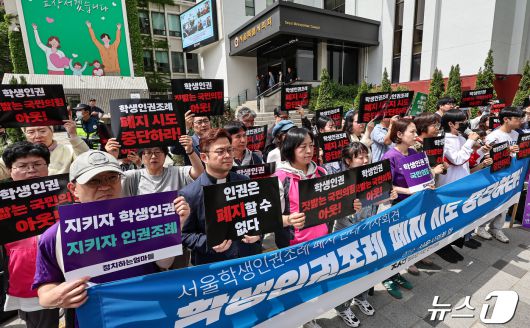 (서울=뉴스1) 김도우 기자 = 학생인권법과 청소년인권을 위한 청소년-시민전국행동 활동가들이 26일 서울 중구 서울시의회 앞에서 학생인권조례 폐지 시도 중단 촉구 기자회견을 하고 있다. 2024.4.26/뉴스1