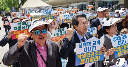 (서울=뉴스1) 김도우 기자 = 학생인권조례폐지시민연대 등 시민단체 활동가들이 26일 서울 중구 서울시의회 앞에서 열린 학생인권 조례 폐지 촉구 집회에서 구호를 외치고 있다. 2024.4.26/뉴스1pizza@news1.krCopyright ⓒ 뉴스1. All rights reserved. 무단 전재 및 재배포, AI학습 이용 금지.