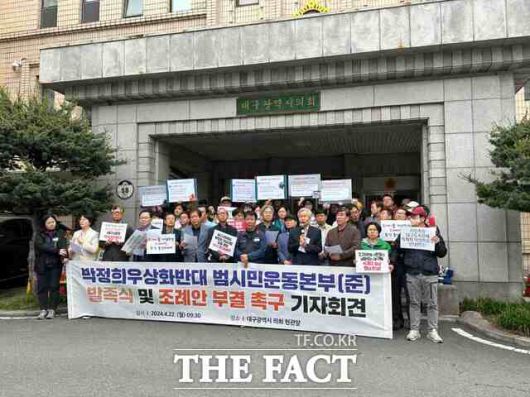 박정희 우상화 반대 범시민운동본부가 지난 22일 대구시의회 앞에서 발족 및 기자회견을 가지고 있다./대구=박성원 기자 |