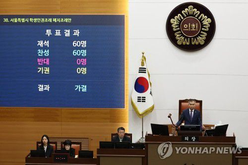 서울시의회는 이날 제323회 임시회 제3차 본회의를 열고 '서울시 학생인권조례 폐지조례안'을 상정, 재석 의원 60명 전원의 찬성으로 통과시켰다.