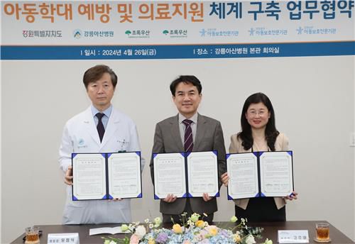 (춘천=연합뉴스) 이해용 기자 = 강원도는 26일 강릉아산병원, 강원아동보호전문기관협회와 '아동학대 예방 및 의료지원 체계 구축을 위한 협약'을 했다.