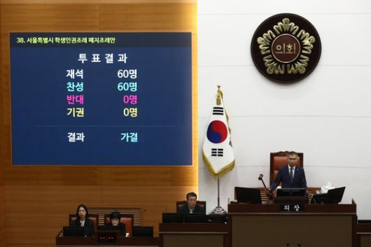 서울시의회는 26일 제323회 임시회 제3차 본회의에서 ‘서울시 학생인권조례폐지조례안’을 상정하고, 재석 의원 60명 전원 찬성으로 안건을 가결했다. 안건 상정에 반발한 더불어민주당 소속 시의원들은 표결에 불참했다.