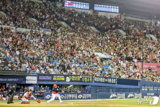 (서울=뉴스1) 민경석 기자 = 26일 오후 서울 송파구 잠실야구장에서 열린 프로야구 '2024 신한 SOL Bank KBO리그' KIA 타이거즈와 LG 트윈스의 경기를 찾은 KIA 팬들이 관중석을 가득 메우고 열띤 응원전을 펼치고 있다. 2024.4.26/뉴스1