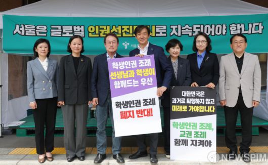 [서울=뉴스핌] 김학선 기자 = 조희연 서울시교육감이 28일 서울 종로구 서울시교육청 1층 현관 앞에 마련된 '학생인권조례 폐지 반대 72시간 천막 농성장'을 방문한 조국 조국혁신당 대표와 함께 피켓을 들고 있다. 2024.04.28 yooksa@newspim.com