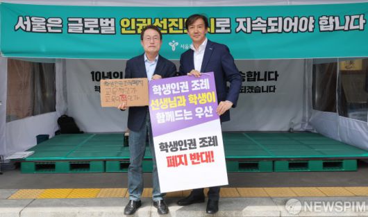[서울=뉴스핌] 김학선 기자 = 조희연 서울시교육감이 28일 서울 종로구 서울시교육청 1층 현관 앞에 마련된 '학생인권조례 폐지 반대 72시간 천막 농성장'을 방문한 조국 조국혁신당 대표와 함께 피켓을 들고 있다. 2024.04.28 yooksa@newspim.com