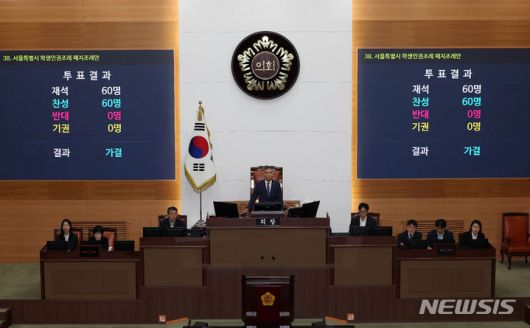 서울시의회 국민의힘은 지난 26일 본회의에서 재석 의원 60명 중 60명 찬성으로 '서울시 학생인권조례 폐지 조례안'을 통과시켰다. 민주당 소속 시의원들은 조례 폐지에 반대하면서 표결에 불참했다.