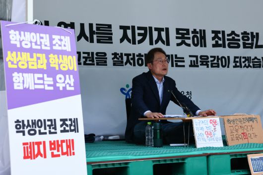 조희연 서울시교육감이 28일 서울 종로구 서울시교육청에 마련된 학생인권조례 폐지 반대를 촉구하는 농성장에 앉아 있다. |