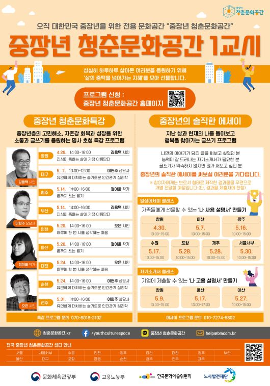 이 특강은 지난해 중장년층 세대의 인문 활동과 여가문화 향유를 활성화하고, 인생 후반기 재도약을 지원하고자 고용부와 협력해 재취업지원기관인 '중장년 내일센터'에 조성한 전국 '중장년 청춘문화공간'에서 진행된다. 중장년의 전용 문화공간인 청춘문화공간은 올해 13개의 공간을 추가 조성해, 연중 다양한 인문‧여가문화 프로그램 제공할 계획이다.