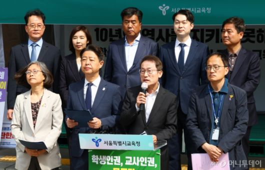 [서울=뉴시스] 황준선 기자 = 조희연(앞 줄 왼쪽 세 번째) 서울시교육감이 29일 오전 서울 중구 서울시교육청에서 열린 서울 학생인권조례 폐지 반대 및 학생인권법 제정 결의를 위한 서울시교육감·더불어민주당 국회의원 공동 기자회견에서 발언을 하고 있다. 2024.04.29. /사진=황준선 |