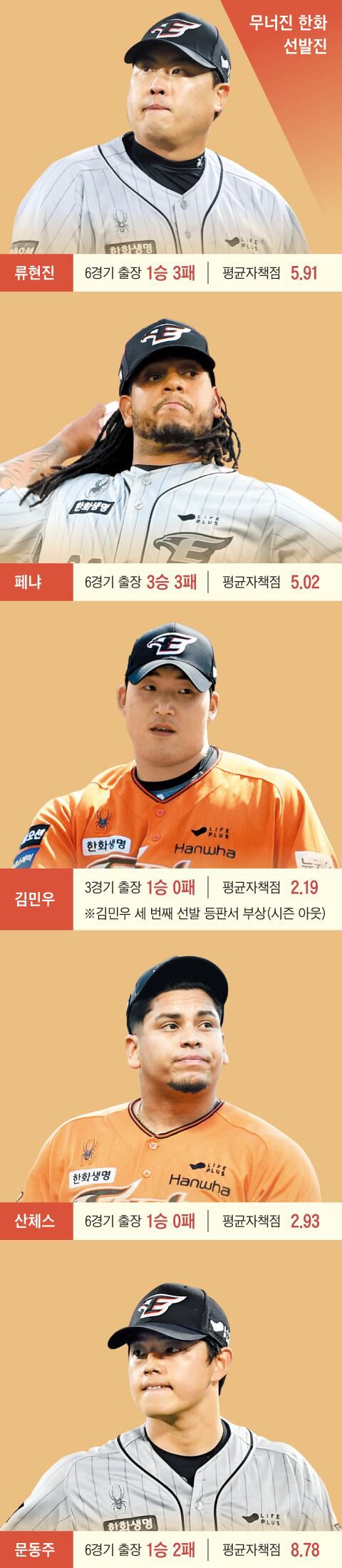 최근 부진에 대해 전문가들은 “선발진이 예상보다 고전하고 있다”고 입을 모았다. 류현진이 한화에 복귀했을 때만해도 전문가들은 한화를 이번 시즌 ‘5강(强)’으로 꼽았다. “류현진-페냐-문동주-산체스-김민우로 이어지는 선발투수 라인업은 10개 구단 중 최강”이라는 평가까지 나왔다. 실제로 이들이 시즌 초 나란히 호투하면서 한화도 상승세를 달렸다.