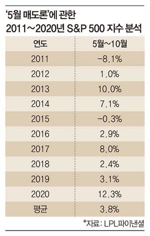 샌디에이고에 본사를 둔 미국 투자사 LPL파이낸셜이 2011~2020년 뉴욕증시 데이터를 분석해본 것도 참고할 만하다. 10년 동안 S&P 500 지수는 매년 5~10월 동안 평균 3.8% 올랐다. 주가가 하락한 연도는 2011년(-8.1%)과 2015년(-0.3%)이다. 올해의 경우 월가 투자은행들은 ‘미국 중앙은행’ 연방준비제도(Fed·연준)의 기준금리 지연 리스크에도 불구하고 미국주식 낙관론을 내고 있다. 올해 S&P 500 지수가 잇달아 최고치 기록을 내온 가운데, 지난 달 글로벌 투자은행 웰스파고는 S&P 500 지수 연말 목표치를 기존 4625에서 5535로 높였다. 또한 올해 S&P 500의 주당 순이익 추정치 역시 기존 235달러에서 242달러로 상향했다.미국주식 낙관론을 낸 것과 관련해 크리스토퍼 하비 웰스파고 주식 담당 최고 전략가는 “올해 상반기 주식시장 변동성이 클 것으로 예상하지만 그럼에도 불구하고 상승 여력이 있다고 본다”면서 “하반기에는 멜트업(melt-up) 가능성이 더 커질 것”이라고 말했다. 멜트 업이란, 자산 가격이 투자자들의 낙관적 태도에 힘입어 이례적으로 급등하는 것을 뜻한다. 하비 전략가의 분석에 따르면 5월에 주식을 매도하는 경우 자칫 반등 시점을 제때 잡지 못하면 하반기 상승장에서 상대적으로 뒤처질 수 있다.