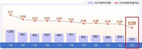 사고사망 만인율은 0.39로 전년(0.43)보다 낮아지며 1999년 통계 작성 이후 처음으로 0.3대에 진입했다. 사고사망 만인율이 1이면 1만명당 1명이 사망했다는 뜻이다.