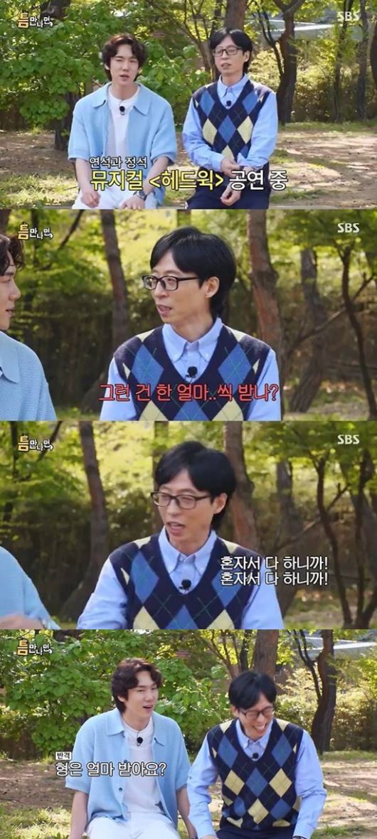 이를 듣고 있던 유재석은 "궁금해서 그러는데, 그런건 얼마 정도 받냐. 혼자 다 하는거 아니냐"고 돌직구 질문을 던졌다.