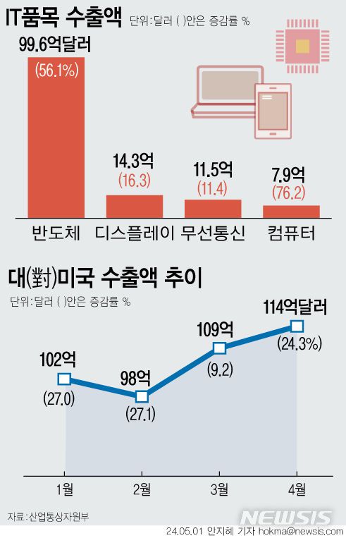 [서울=뉴시스] 지난달 수출이 13.8% 늘어나며 수출 플러스를 7개월 연속 이어갔다. 우리 수출 최대 품목인 반도체는 56.1% 증가한 99억6000만 달러(13조8145억원)를 기록했다. 대미 수출은 작년 동월보다 24.3% 증가한 114억 달러로 집계됐다. 역대 최고치이자 대중국 수출 규모를 넘어선 수준이다. (그래픽=안지혜 기자)hokma@newsis.com |